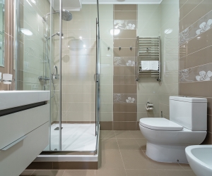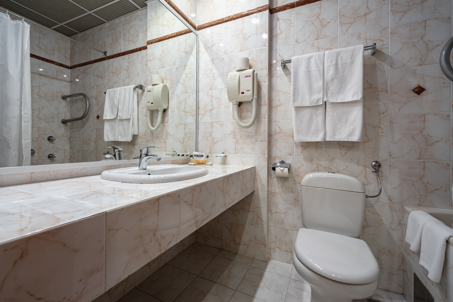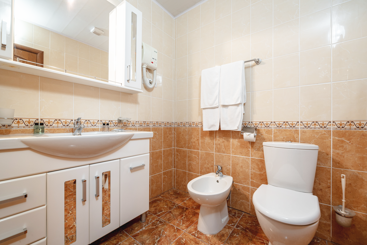 В ванной комнате: два умывальника; унитаз; биде; джакузи с душевой кабинкой; туалетные принадлежности; два банных халата; фен.