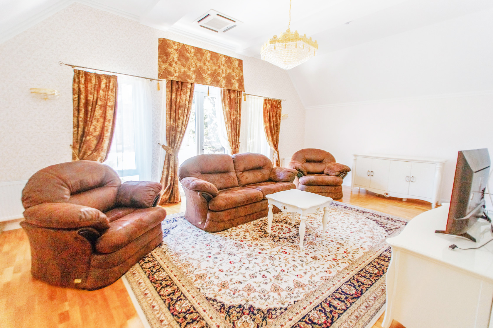 В номере: центральное кондиционирование; покрытие — паркет; мини-бар; холодильник; два плазменных телевизора; электрочайник, музыкальный центр; колонки; телефон; радио.