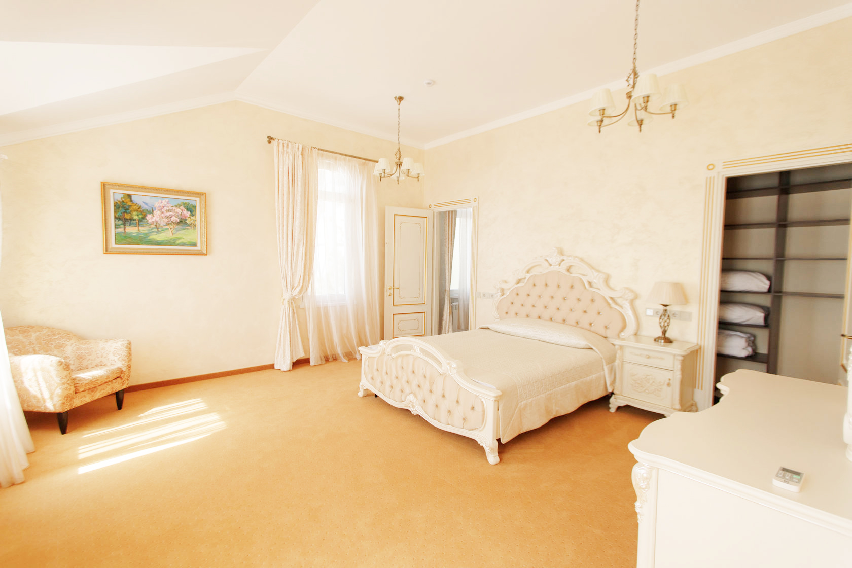 Большая спальня: большая двуспальная кровать, прикроватные тумбочки, туалетный столик, декоративные колонны, гардеробная, сейф.