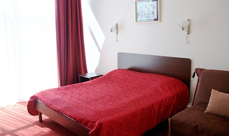 -в номере: вешалка, диван два основных места, зеркало, кровать двуспальная два основных места, прикроватные тумбочки, стол, стулья, шкаф, кондиционер, мини-холодильник, набор посуды, телевизор, электрочайник;