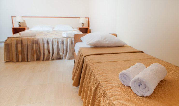 -в номере: вешалка, зеркало, кровать двуспальная, кровать полутороспальная, прикроватные тумбочки, стол, стул, шкаф, кондиционер, микроволновая печь, набор посуды, стиральная машина, телевизор, холодильник;