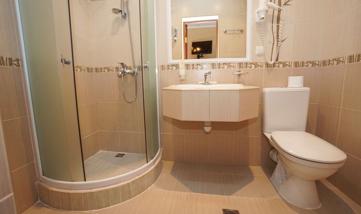 -в ванной комнате: душ, туалетные принадлежности, фен;