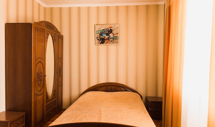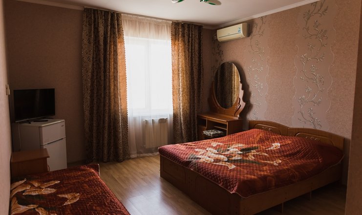 -в номере: вешалка, диван раскладной, зеркало, кровать двуспальная 2, прикроватные тумбочки, шкаф, кондиционер, телевизор, холодильник;